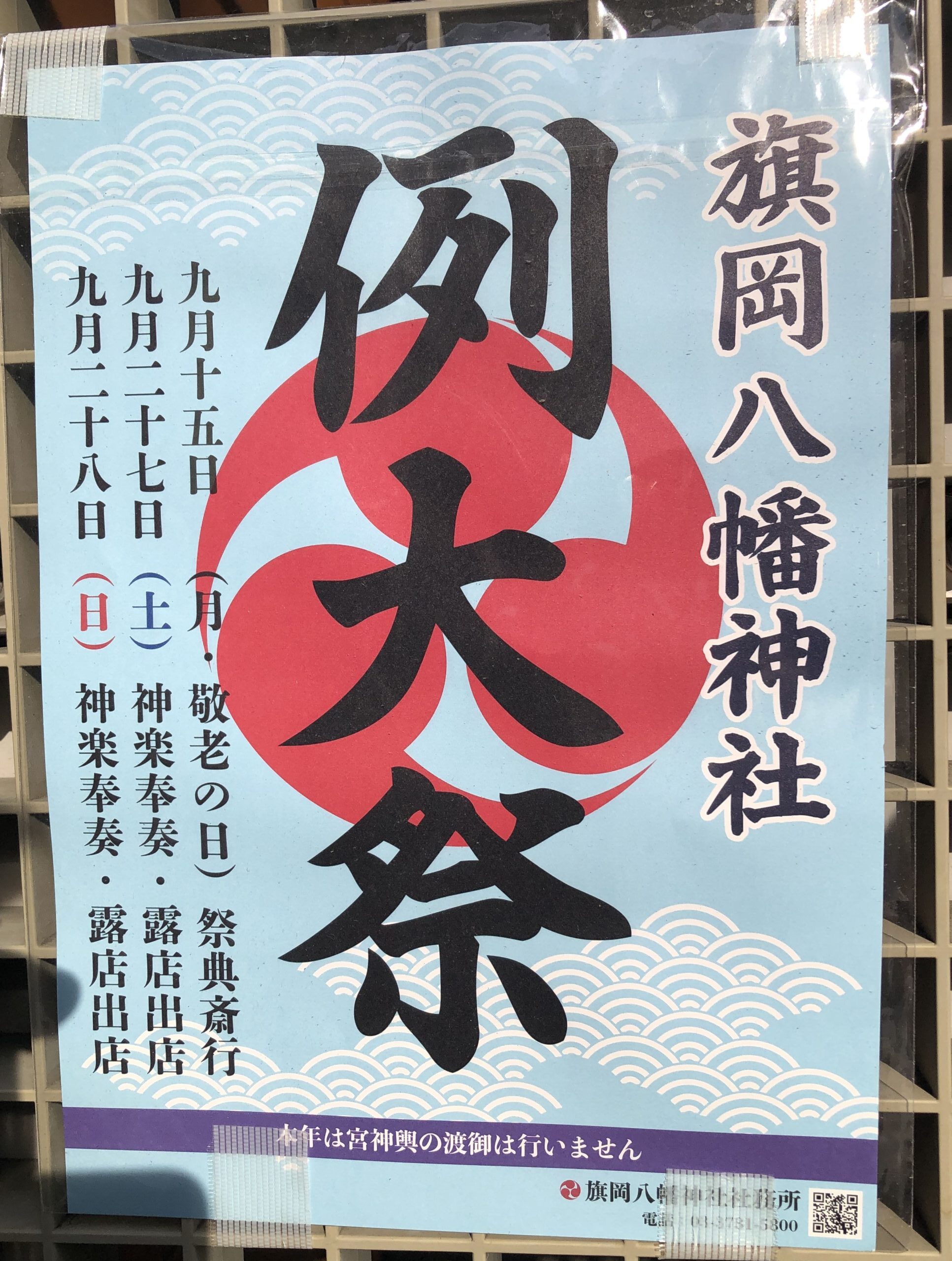 地元の「旗が岡八幡神社」のお祭りは例年9月の第二土・日曜日に行われるのですが、近年の「いつまで猛暑」を見越して今年から9月の最終週の土日に変更になりました。