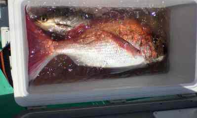 「結構いい引きしてんじゃん!」上がってきたのは真鯛の5kgほどの大物!「おいおいやり過ぎだよ最初から」